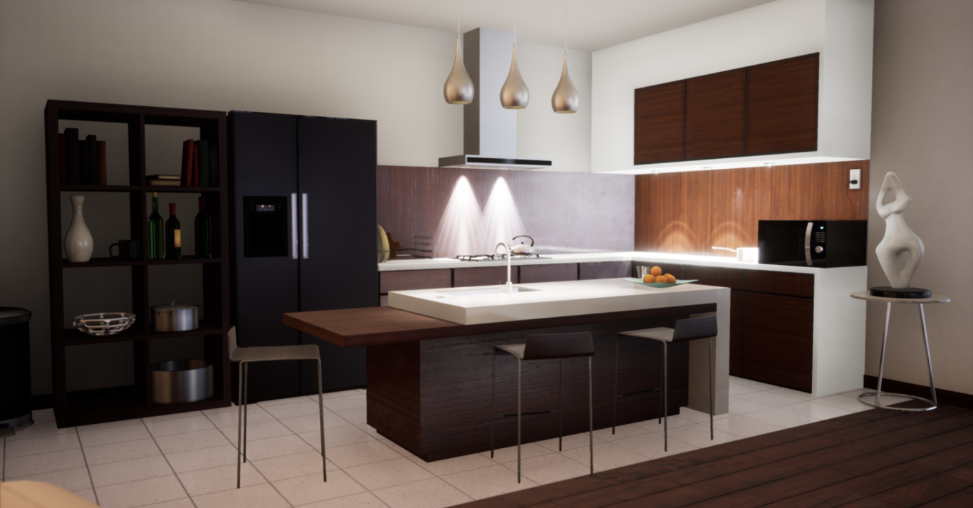 A warmly lit living room created in Unreal Engine 4 using Marketplace content.